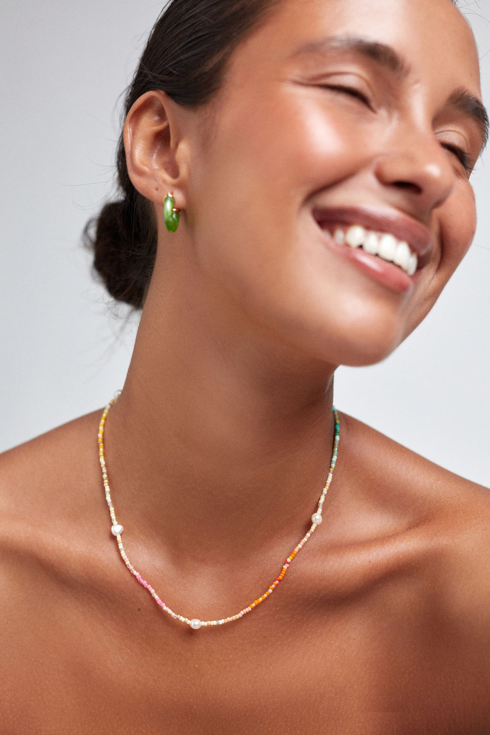 RAINBOW NOMAD is for the wanderer at heart — mixing tie-dye inspired colors with one-of-a-kind freshwater pearls. A delicate piece with a playful soul and a story to tell.- Crafted in brass with 18-karat gold plating and anti-tarnish e-coating