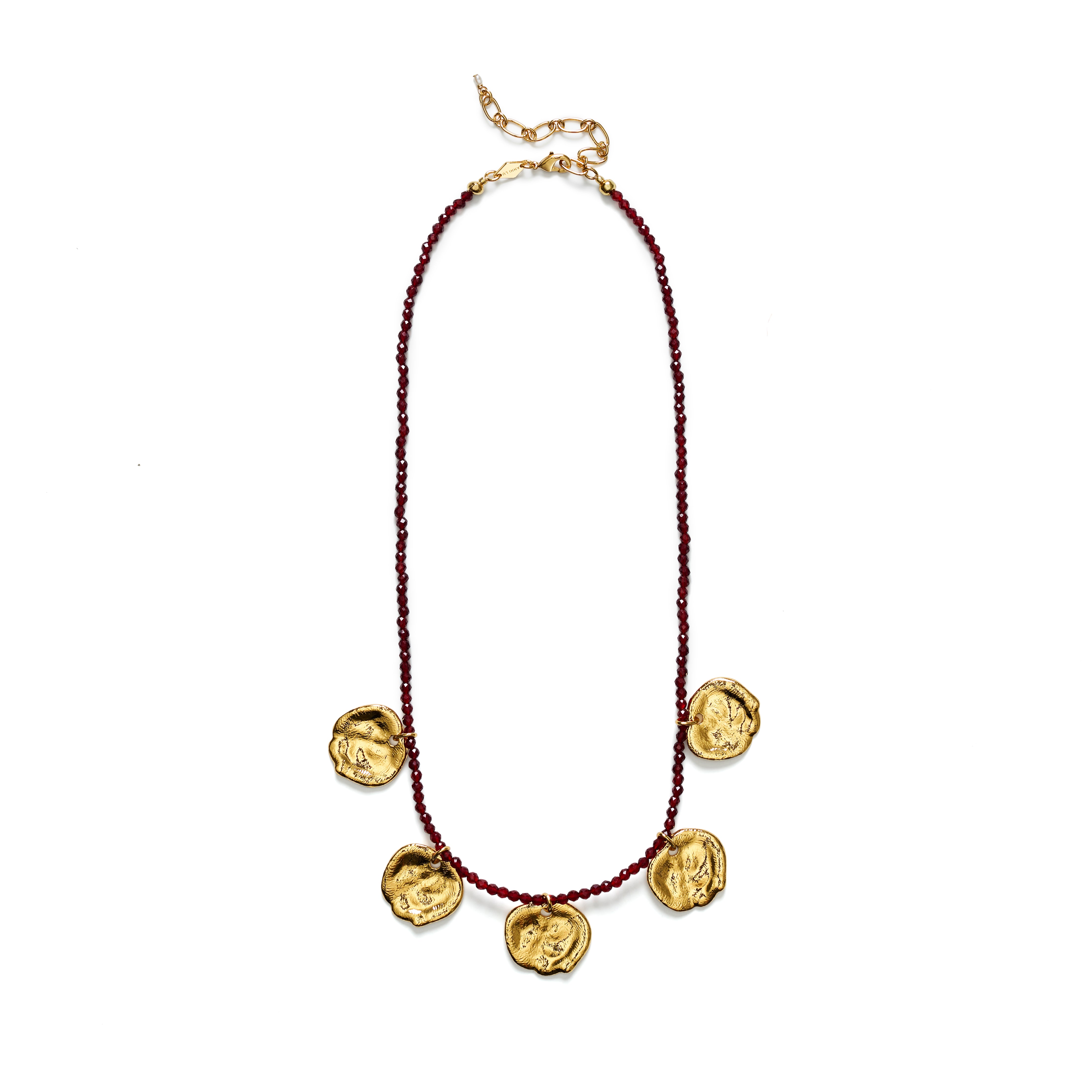 Rich burgundy beads, pearls, and five golden coin pendants — Dream Catcher feels like a lucky charm picked up on your travels.