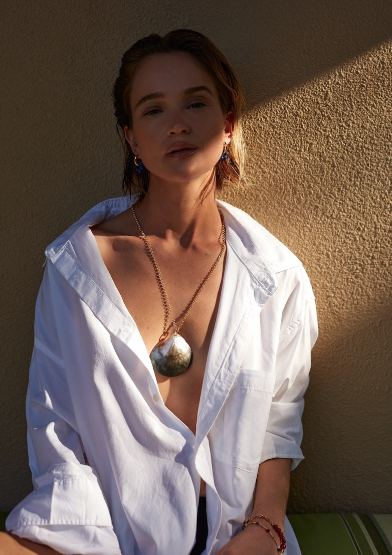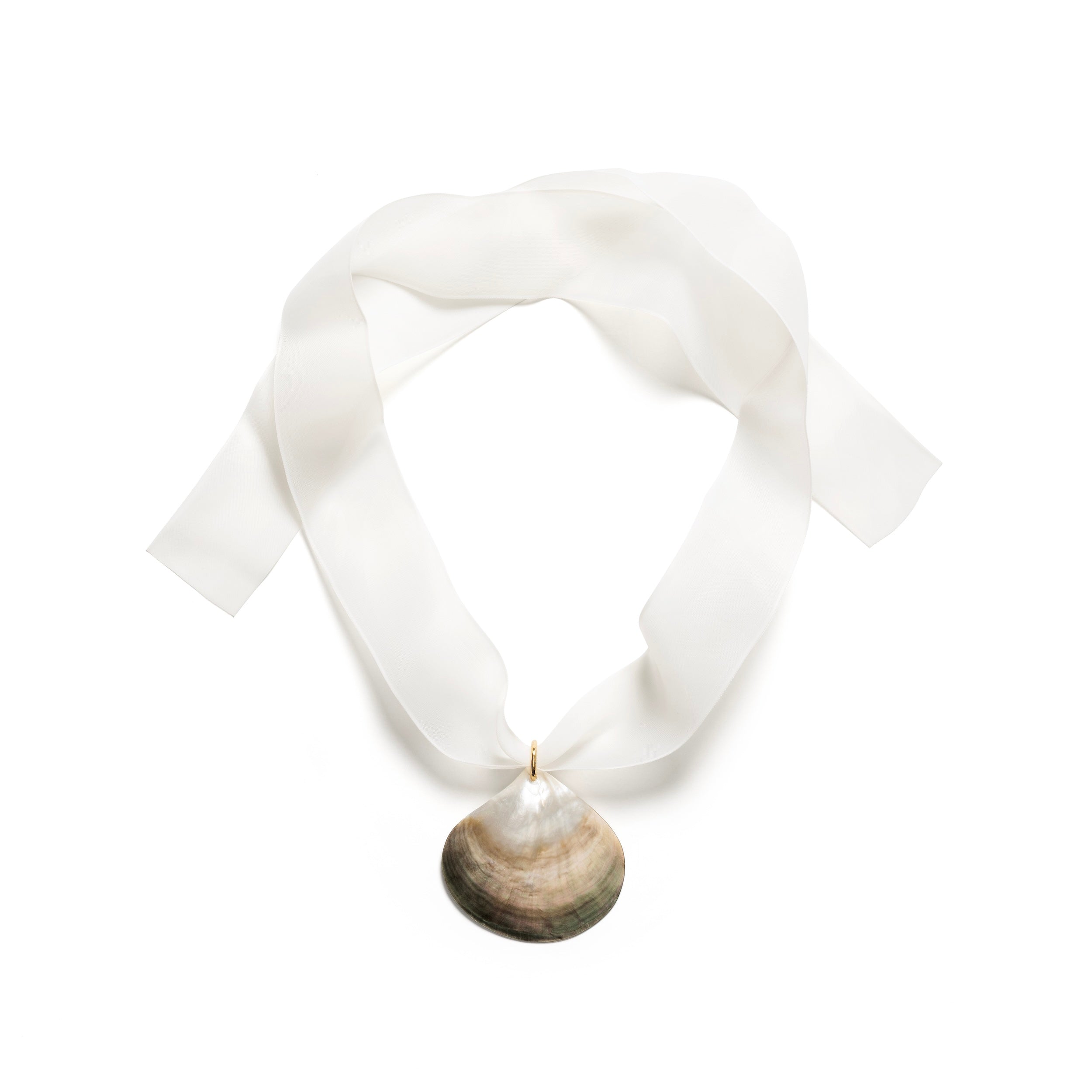 GOLDEN SHELL makes a refined statement — a sculptural shell resting on a soft ecru ribbon, designed to be worn close to the neck as a choker. Paired with a chunky rolo chain, it invites play and transforms effortlessly from understated elegance to bold expression.