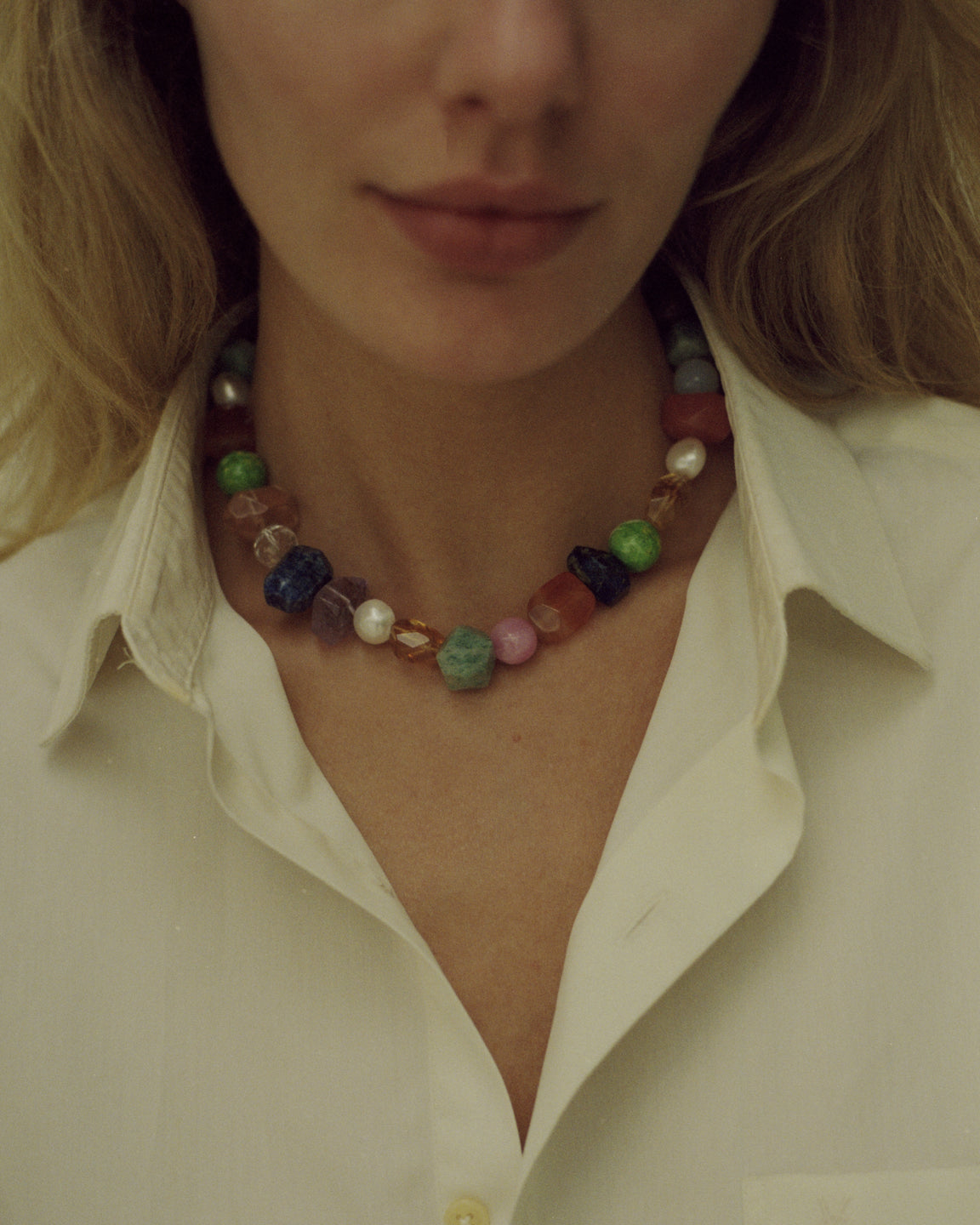 •  Detailed in Quartz, cultured freshwater pearl, amethyst, amazonite, lazurite, agate, glass, imperial jasper & jasper